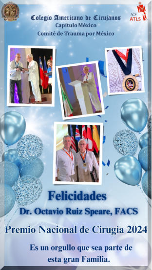 Todos los derechos del contenido de esta página son propiedad del Capítulo México del Colegio Americano de Cirujanos, por lo que queda prohibida la reproducción parcial o total de esta obra, es decir, ninguna parte de esta página puede reproducirse, almacenarse o transmitirse de ninguna forma, ni por ningún medio, sea éste electrónico, químico, fotográfico, magnético, mecánico, óptico, de grabación o fotocopia, ya sea para uso personal o de lucro sin previa autorización de los autores.